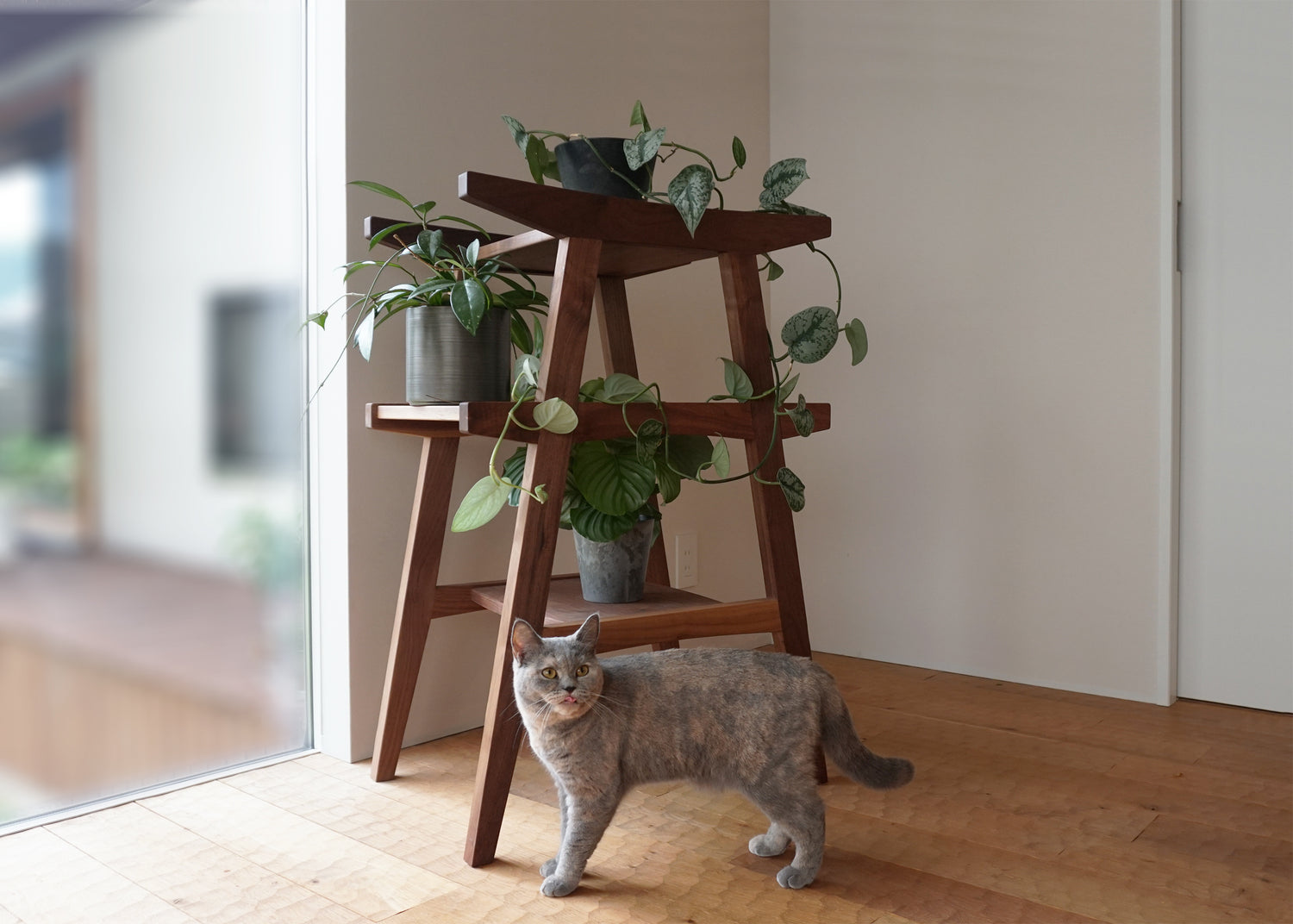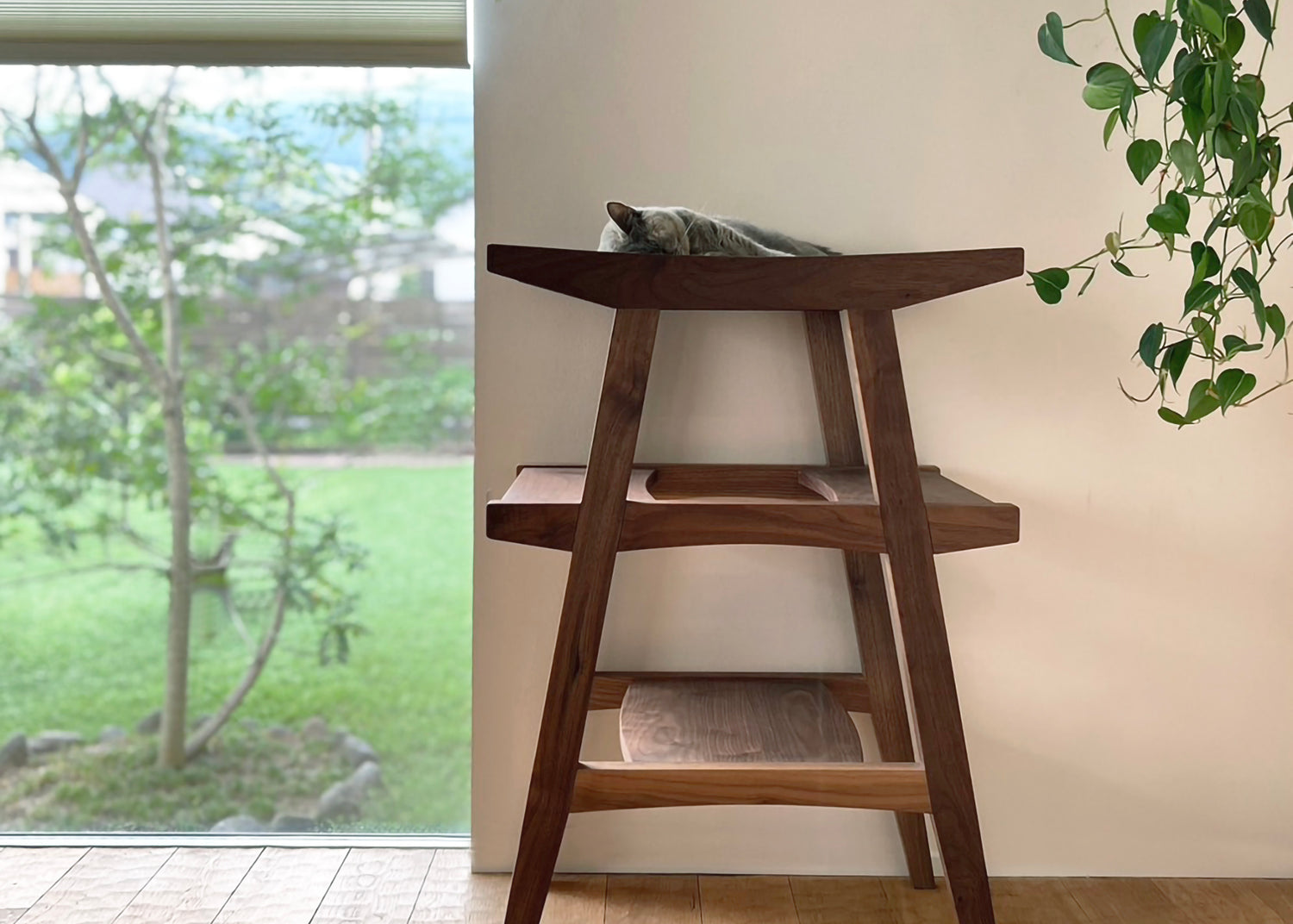 従来のキャットステップ然とした形ではないので、植物や小物などをディスプレイするシェルフのような使い方も出来ます
