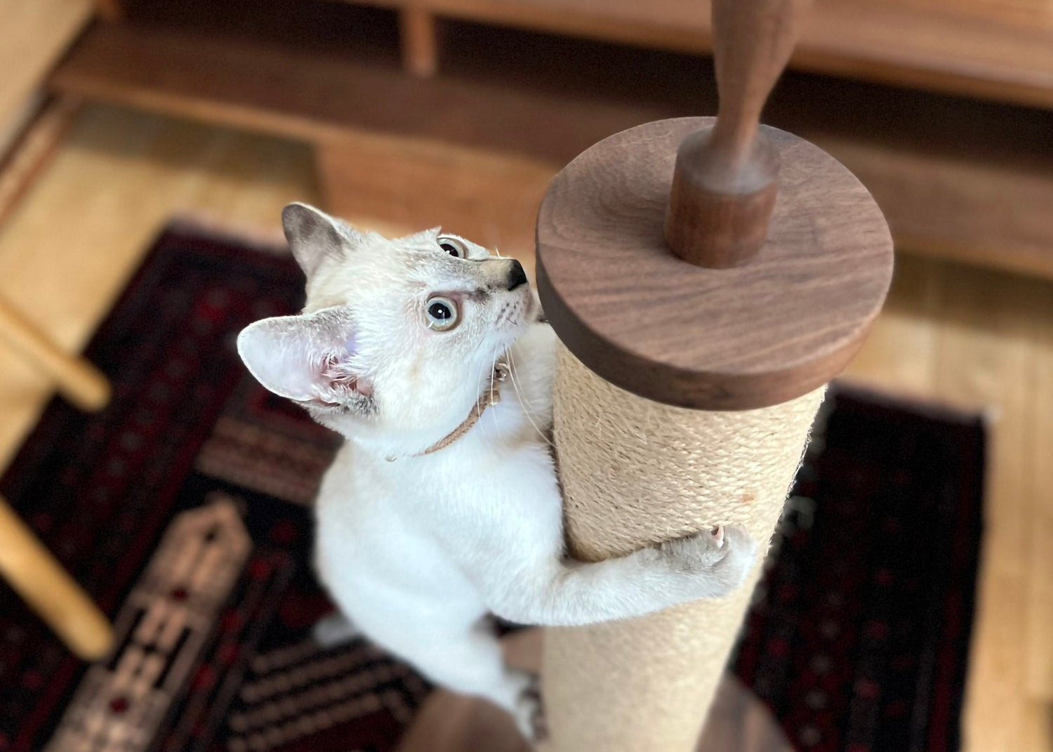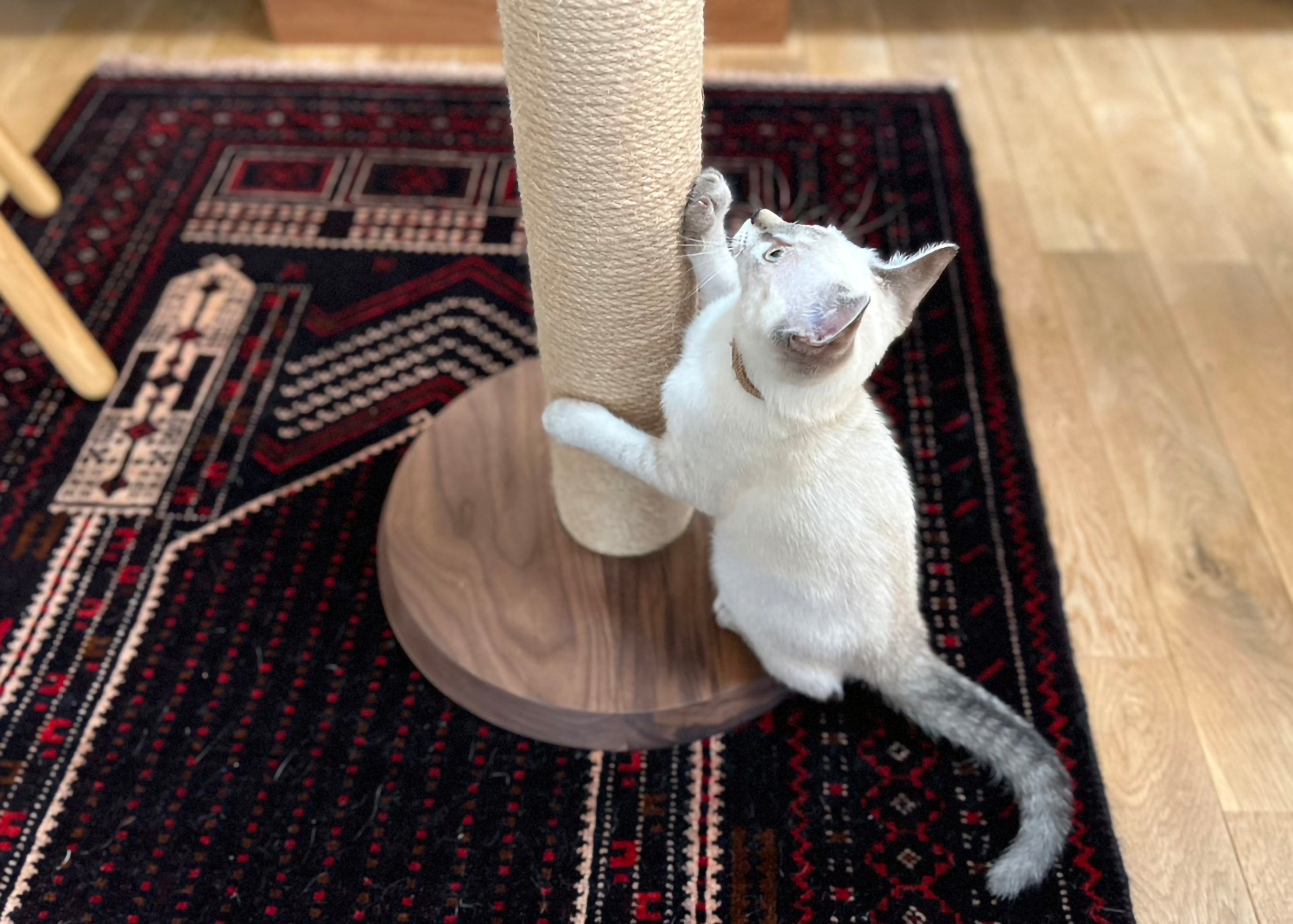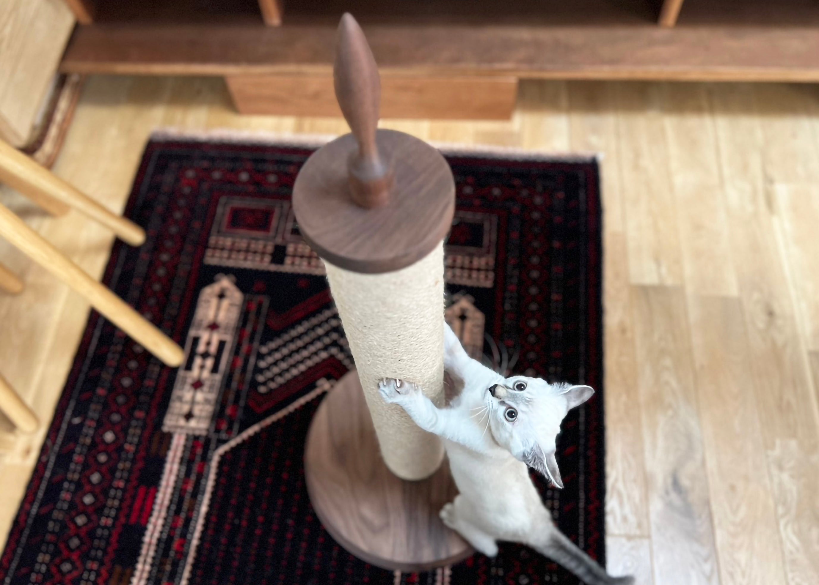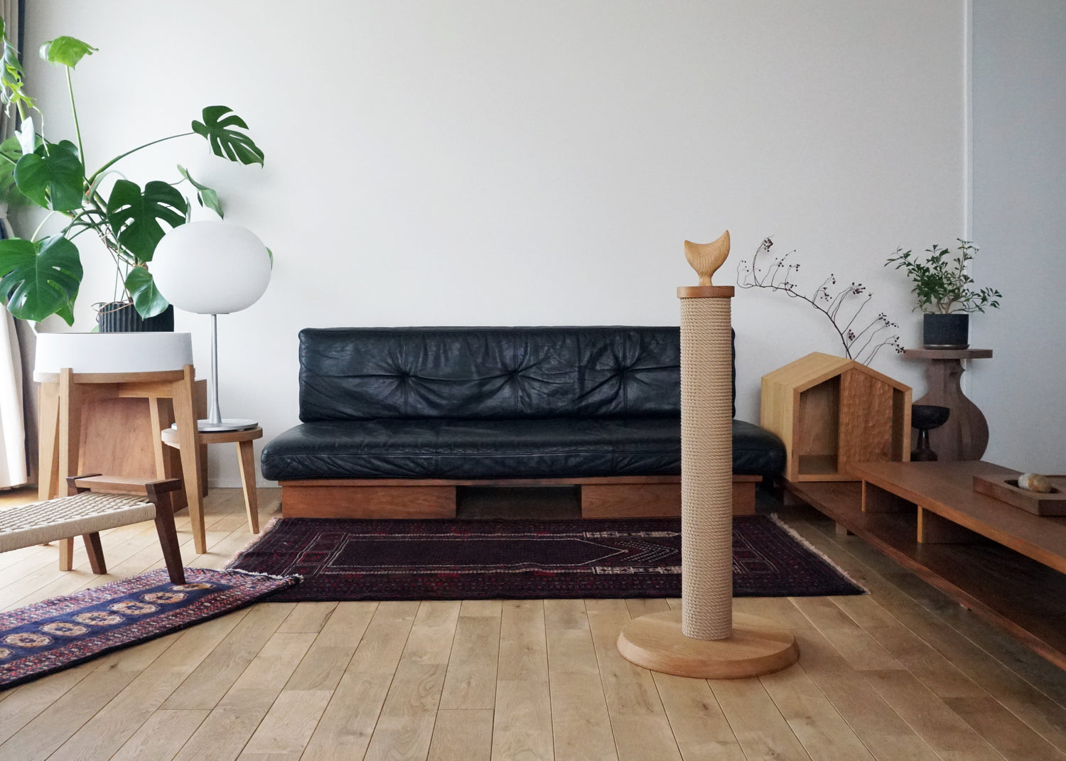 天然木の質感は、空間から浮いてしまいがちなツメとぎポールとインテリアをつなげ、使っていない時でもサマになるツメとぎポールです