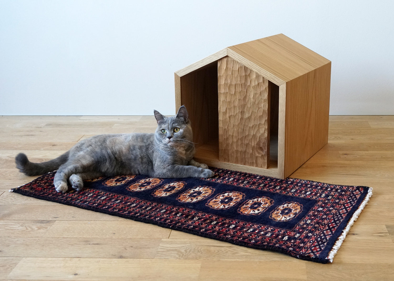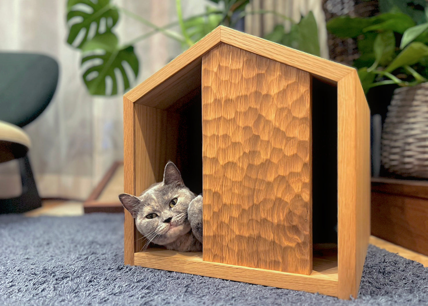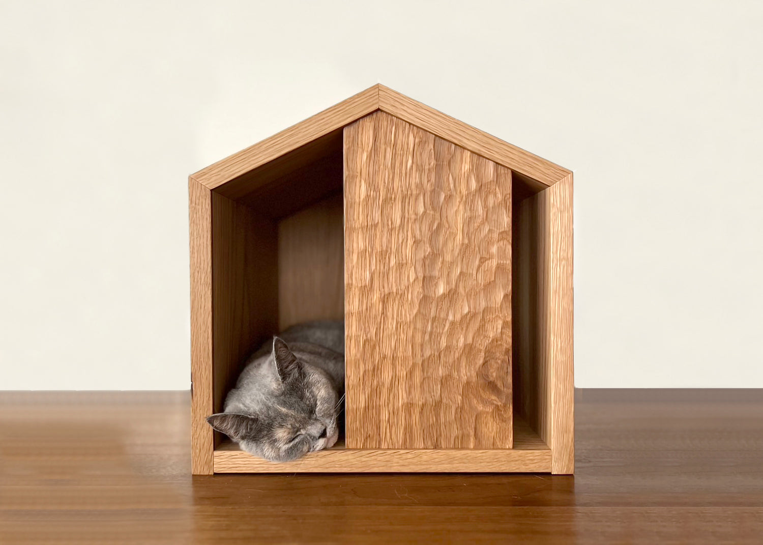 シンプルな家型のネコハウスは入口のアシンメトリーな名栗(ナグリ)加工がポイント