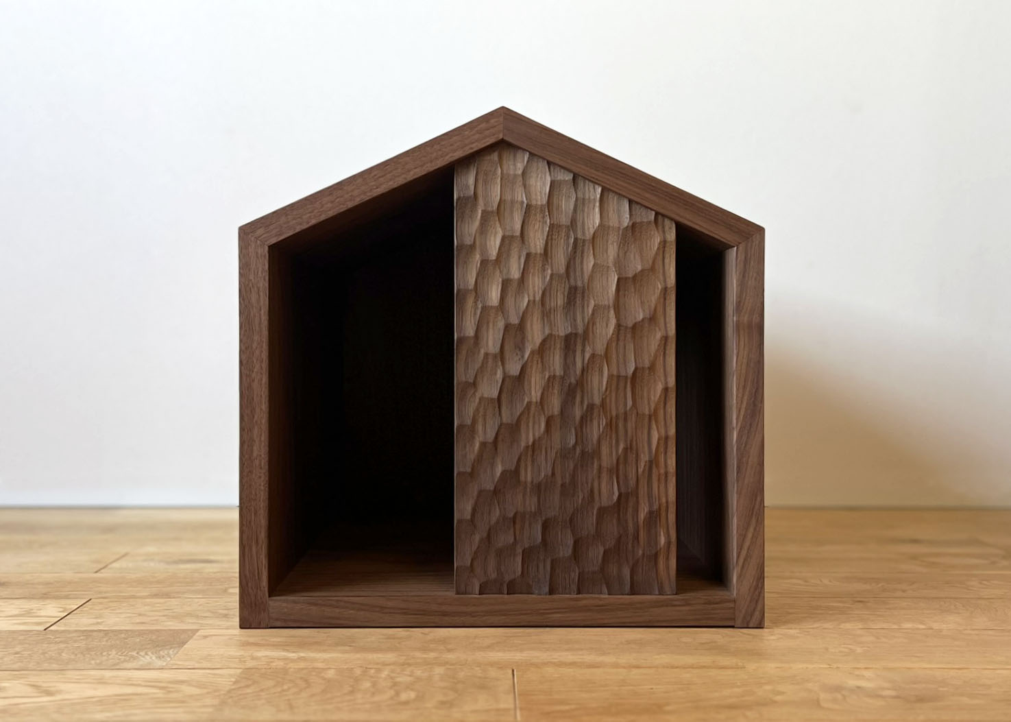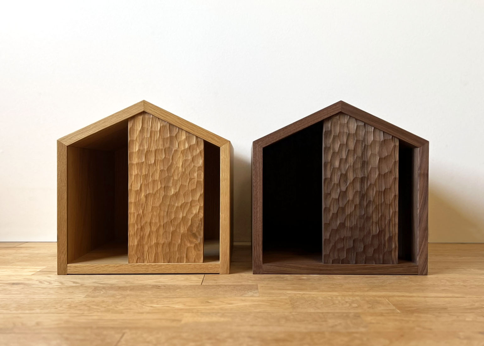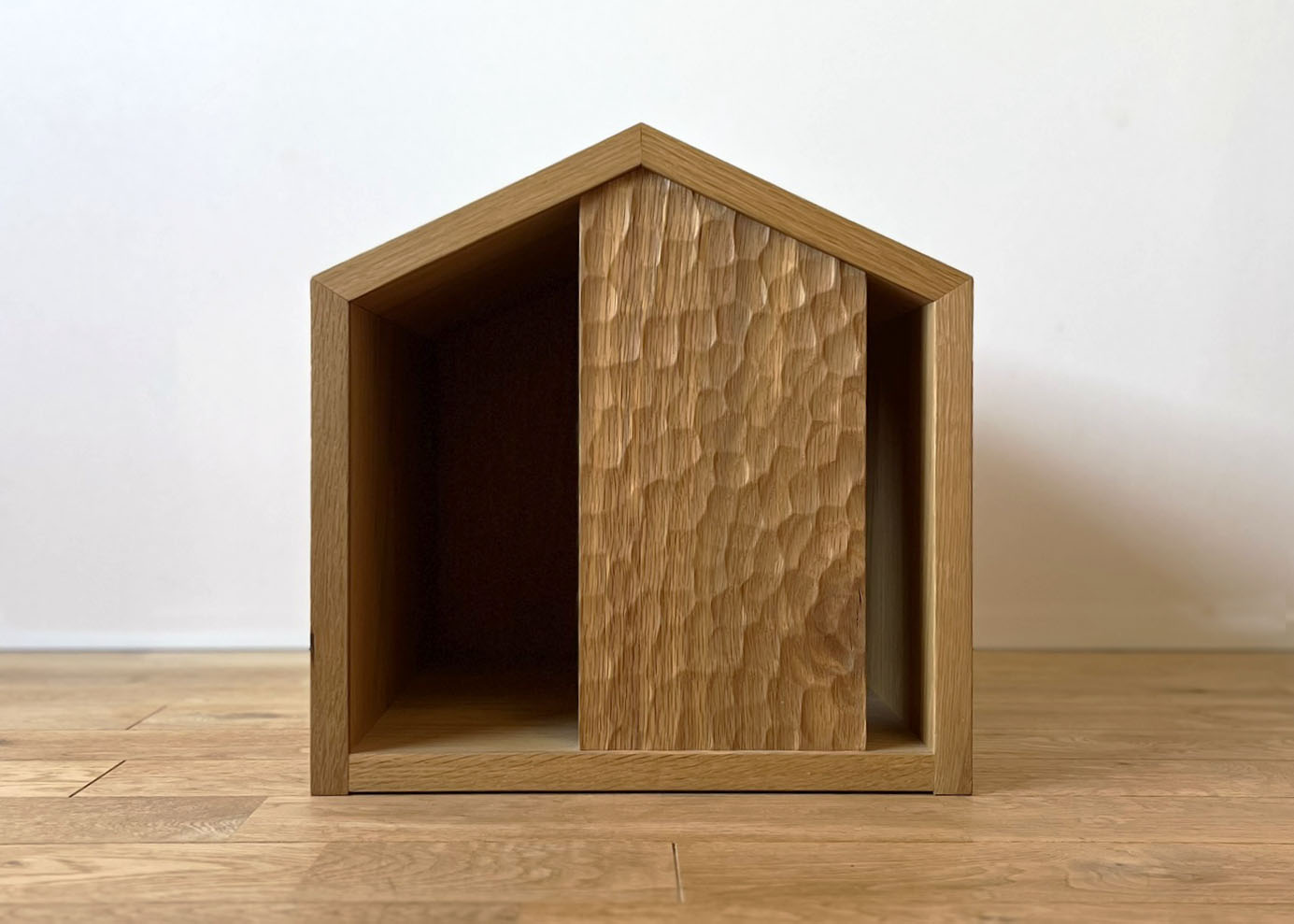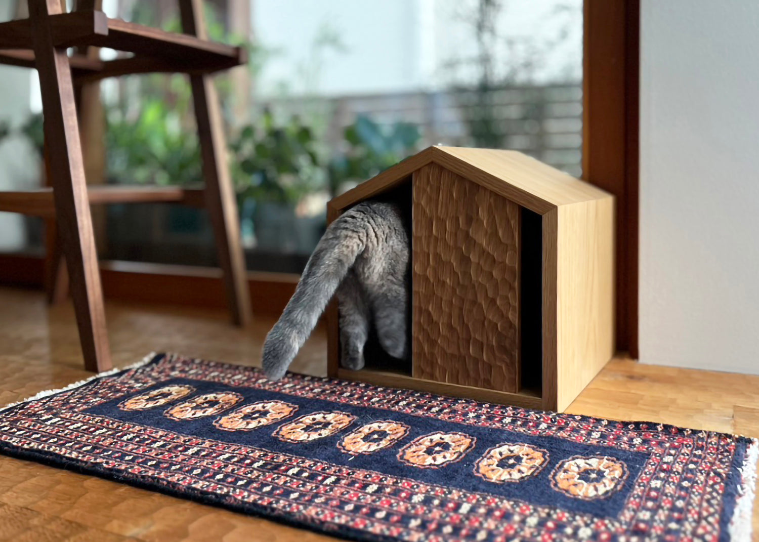 シンプルな家型のネコハウスは入口のアシンメトリーな名栗(ナグリ)加工がポイント