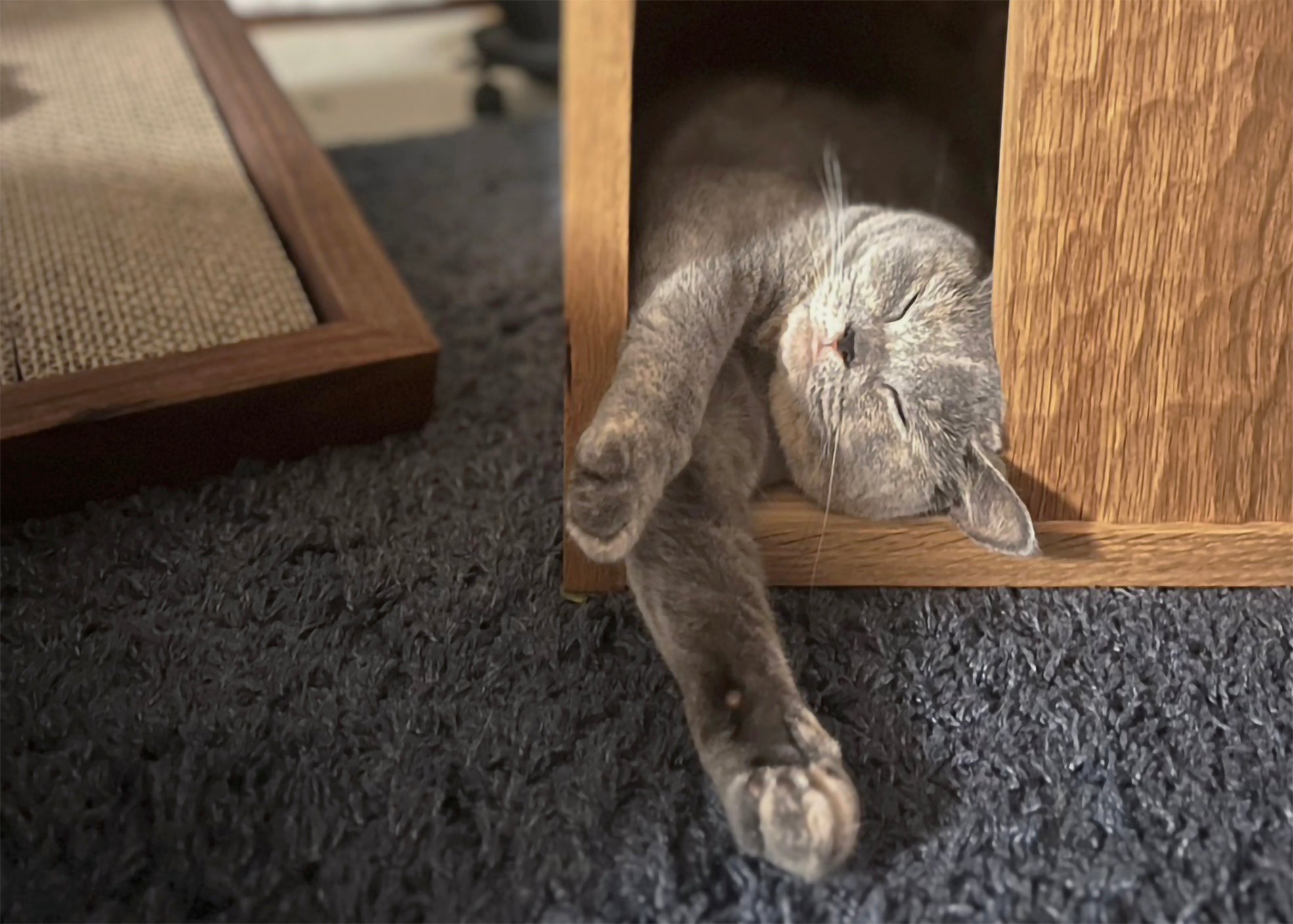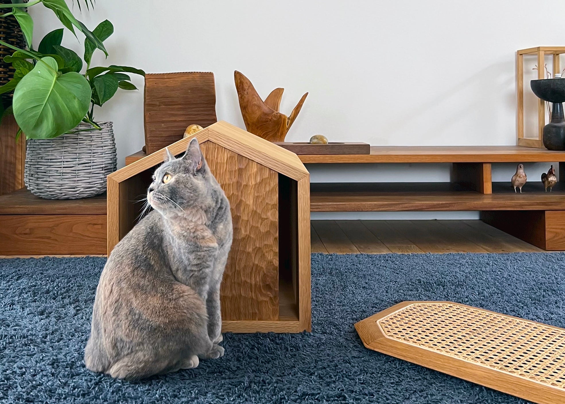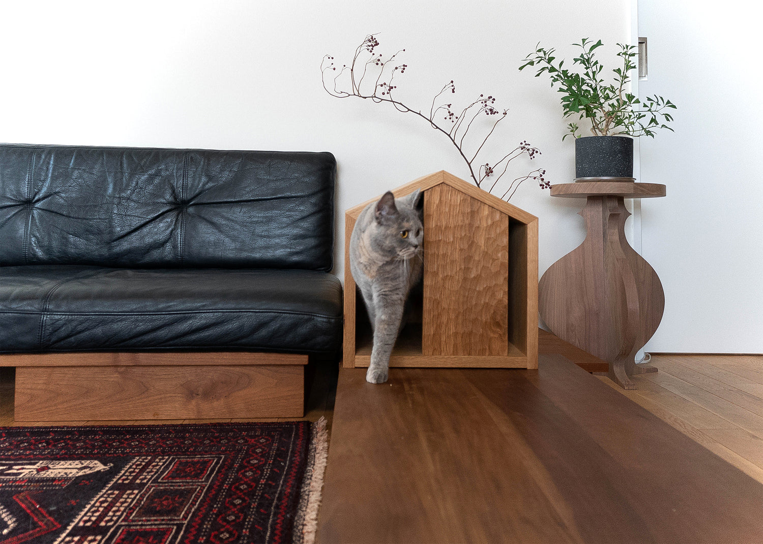 部屋になじむインテリアとして使えるように、ヒト用の家具にも使用される素材のウォールナット・オーク等の無垢材を使用しています